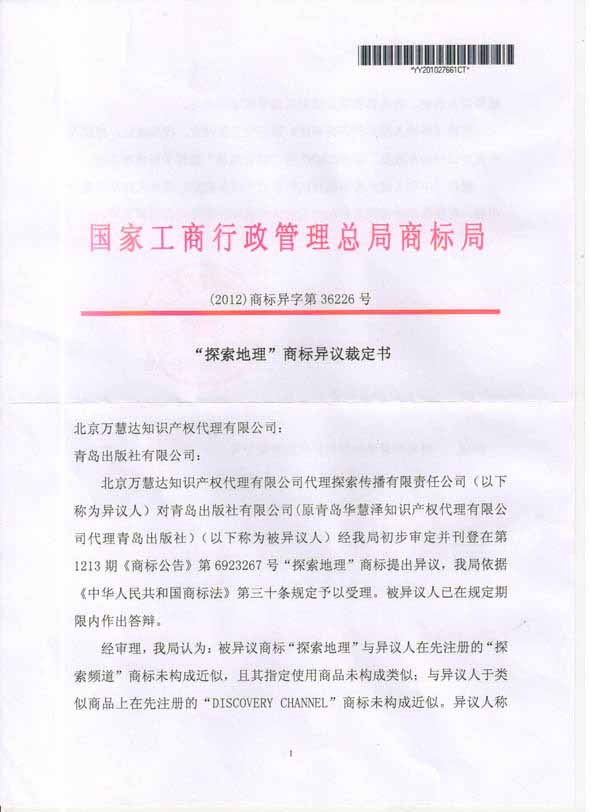 成功代理青島出版社有限公司“探索地理”商標異議答辯案