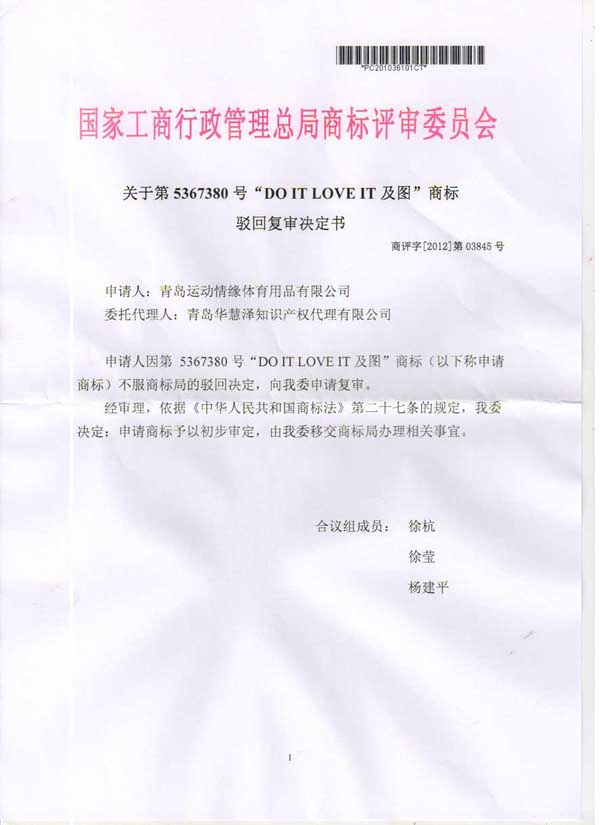 關(guān)于第5367380號“DOITLOVEIT及圖”商標駁回復審決定書(shū)