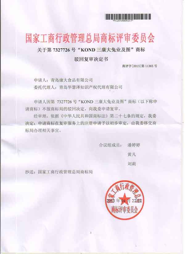 成功代理青島康大食品有限公司“KOND三康大兔業(yè)及圖”商標駁回復審