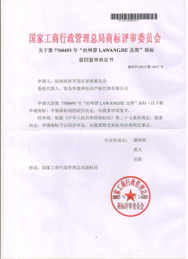 成功代理膠南經(jīng)濟開(kāi)發(fā)區管理委員會(huì )關(guān)于第7760493號“拉網(wǎng)節LAWANGJIE及圖”商標駁回復審