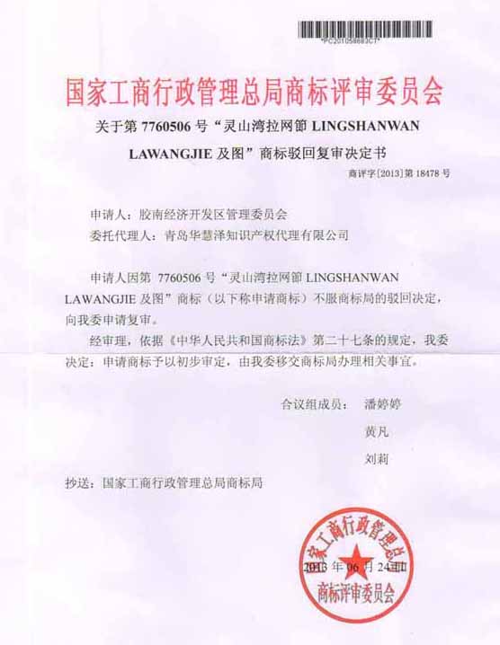 成功代理膠南經(jīng)濟開(kāi)發(fā)區管理委員會(huì )關(guān)于第7760506號“靈山灣拉網(wǎng)節及圖”商標駁回復審