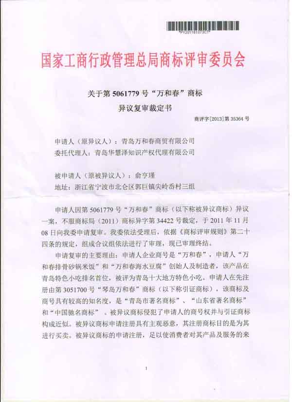成功代理第5061779號“萬(wàn)和春”商標異議復審案