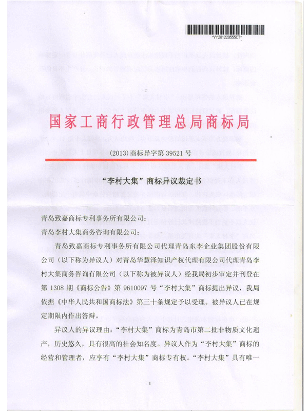 成功代理第9610097號“李村大集”商標異議復審案