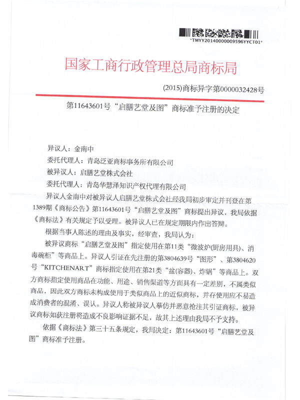 成功代理第11643601號“啟膳藝堂及圖”商標異議答辯案
