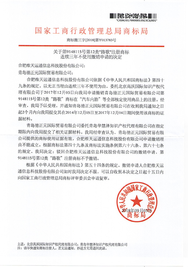 成功代理第9148115號“路歌”商標連續三年不使用撤銷(xiāo)申請答辯案