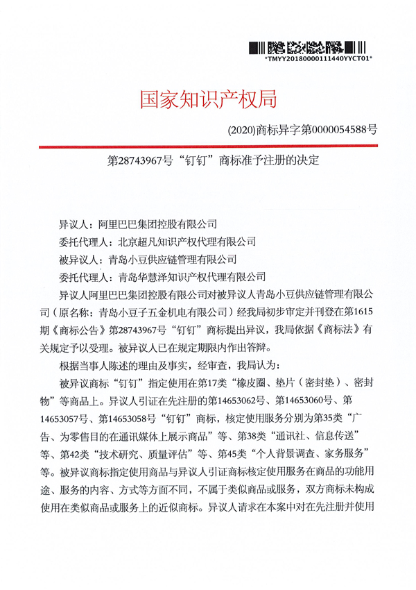 成功代理第28743967號“釘釘”商標異議答辯案