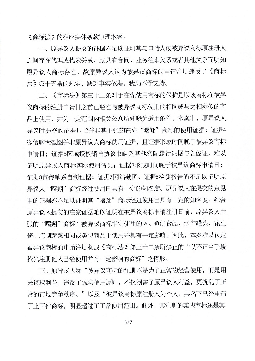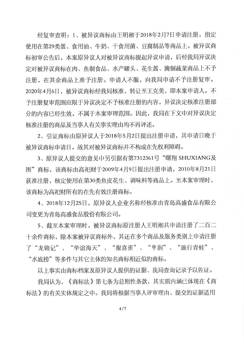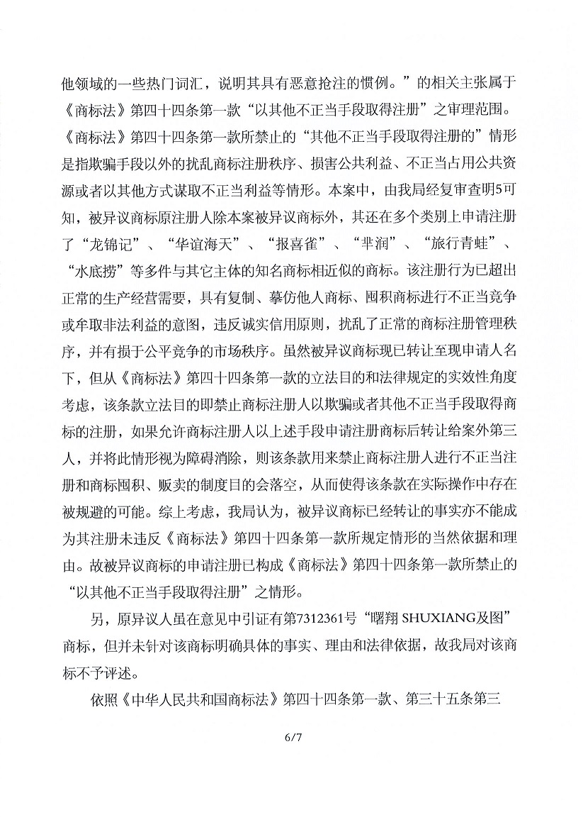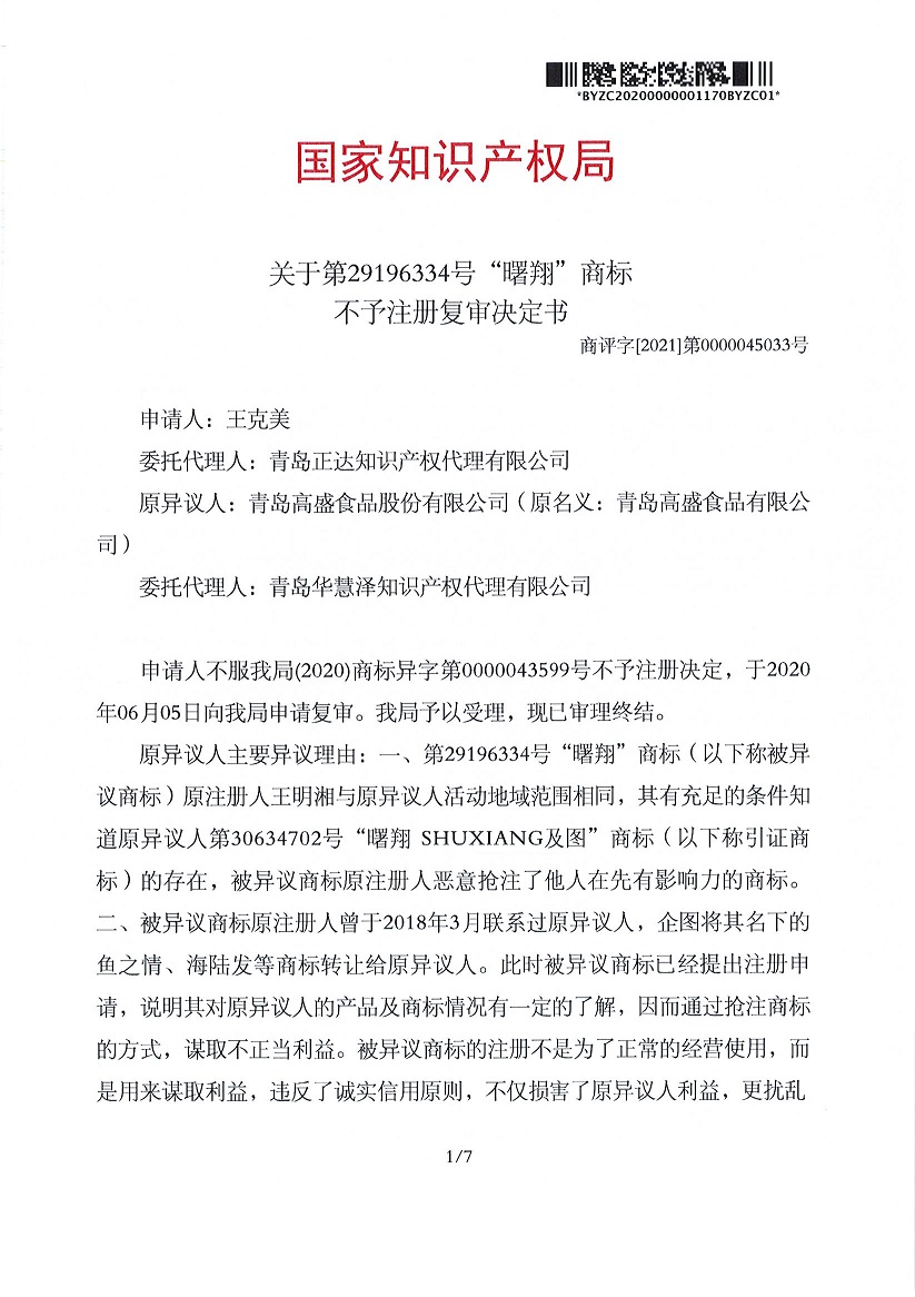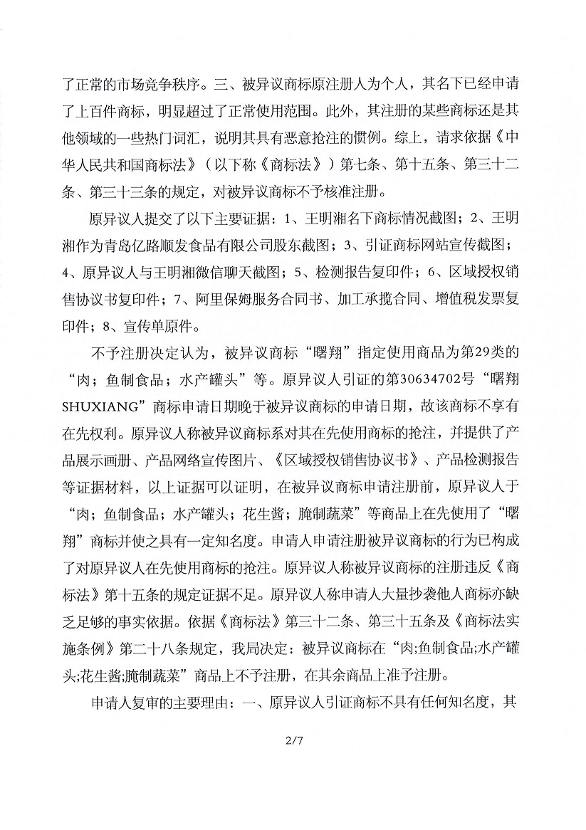 關(guān)于第29196334號“曙翔”商標不予注冊復審決定書(shū)