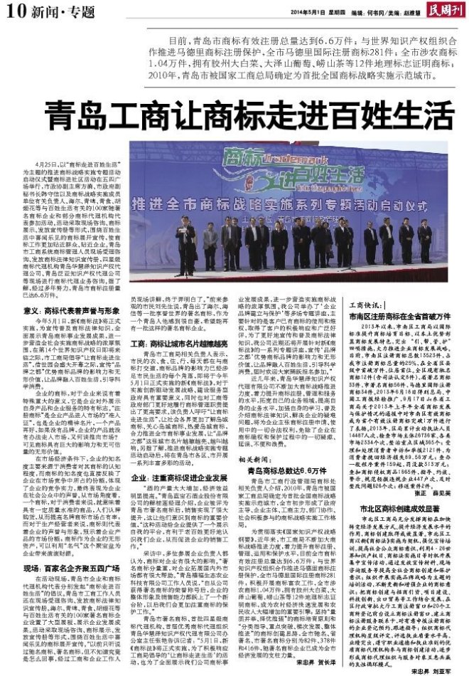 青島市工商局相關(guān)負責人表示,市民的衣、食、住、行,每天都在與商標打交道,商標品牌的影響力已經(jīng)涉足市民生活的每個(gè)角落,即將于今年5月1日正式實(shí)施的新《商標法》,對于實(shí)施創(chuàng )新驅動(dòng)發(fā)展戰略、建設服務(wù)型政府具有重要意義,同時(shí)也對工商等政府部門(mén)更好地履行商標管理職責提出了更高要求。該負責人呼吁“讓商標走進(jìn)生活”,讓社會(huì )各界更加了解島城商標、關(guān)心島城商標、熱愛(ài)島城商標,合力推進(jìn)全市商標事業(yè)發(fā)展,讓“品牌之都”這張城市名片越擦越亮、越叫越響。另?yè)私?,推進(jìn)商標戰略實(shí)施專(zhuān)題活動(dòng)啟動(dòng)后,將在青島市各區、市開(kāi)展一系列豐富多彩的活動(dòng)。