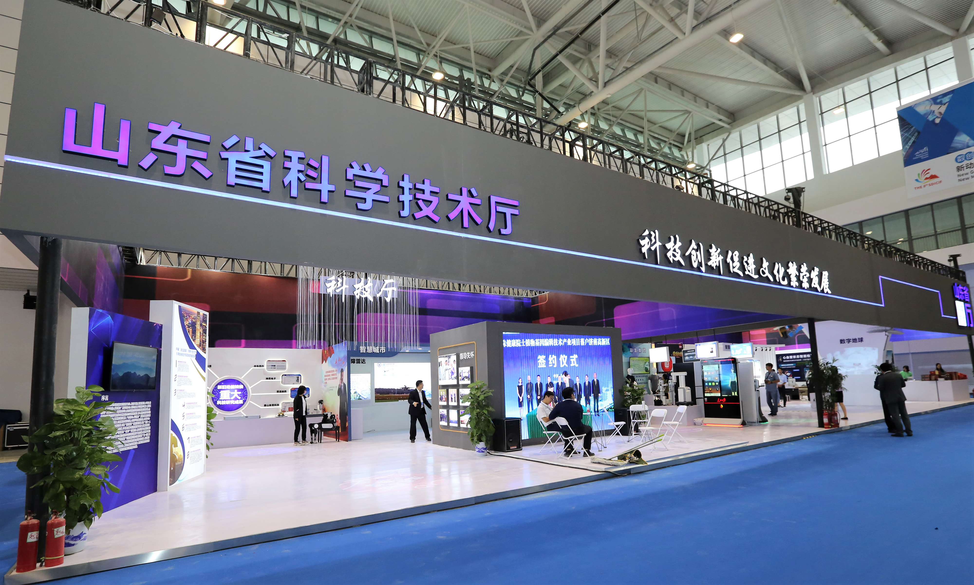 科技創(chuàng )新館為山東文博會(huì )舉辦以來(lái)首次獨立設館,展館共分為九個(gè)展區,分別是序廳、領(lǐng)導關(guān)懷區、重大科技成果展區、智慧城市展區、機器人互動(dòng)交流區、智慧生活展區、物聯(lián)網(wǎng)+智慧健康展區、物聯(lián)網(wǎng)生活展區、數字地球展區。浪潮集團人工智能服務(wù)器、中車(chē)四方公司時(shí)速600公里高速磁浮工程樣車(chē)、中集來(lái)福士“藍鯨一號”半潛式鉆井平臺、海天智能腦接接口康復訓練系統等重大科技成果,機場(chǎng)雷達清障系統、衛星互聯(lián)網(wǎng)系統、城市智慧心臟系統、量子通訊技術(shù)等先進(jìn)技術(shù)以及可實(shí)現走動(dòng)進(jìn)行人機互動(dòng)和交流的系列機器人產(chǎn)品、物聯(lián)網(wǎng)+智慧健康產(chǎn)品等100余個(gè)“高精尖”展項集中精彩亮相,以圖文展示、視頻、互動(dòng)體驗等多種方式,為市民帶來(lái)一場(chǎng)科技創(chuàng )新盛宴。