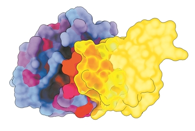 人類(lèi)蛋白質(zhì)KRAS(藍色)與其伴侶之一RAF1(黃色)相互作用的三維圖。