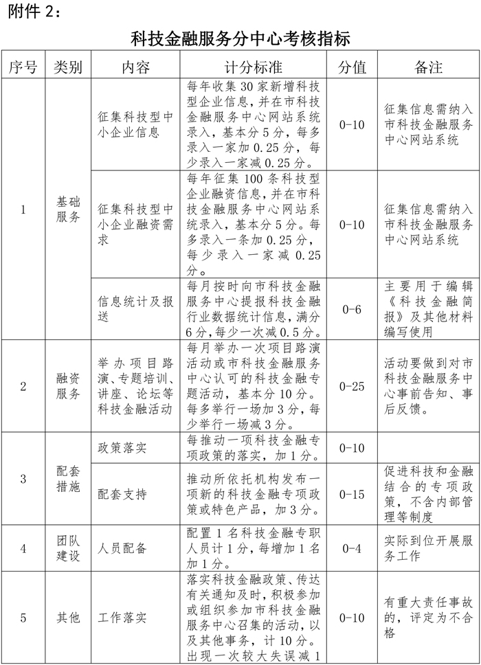 市科技金融服務(wù)中心負責對列入試點(diǎn)的各科技金融服務(wù)分中心組織考核,每年一次。